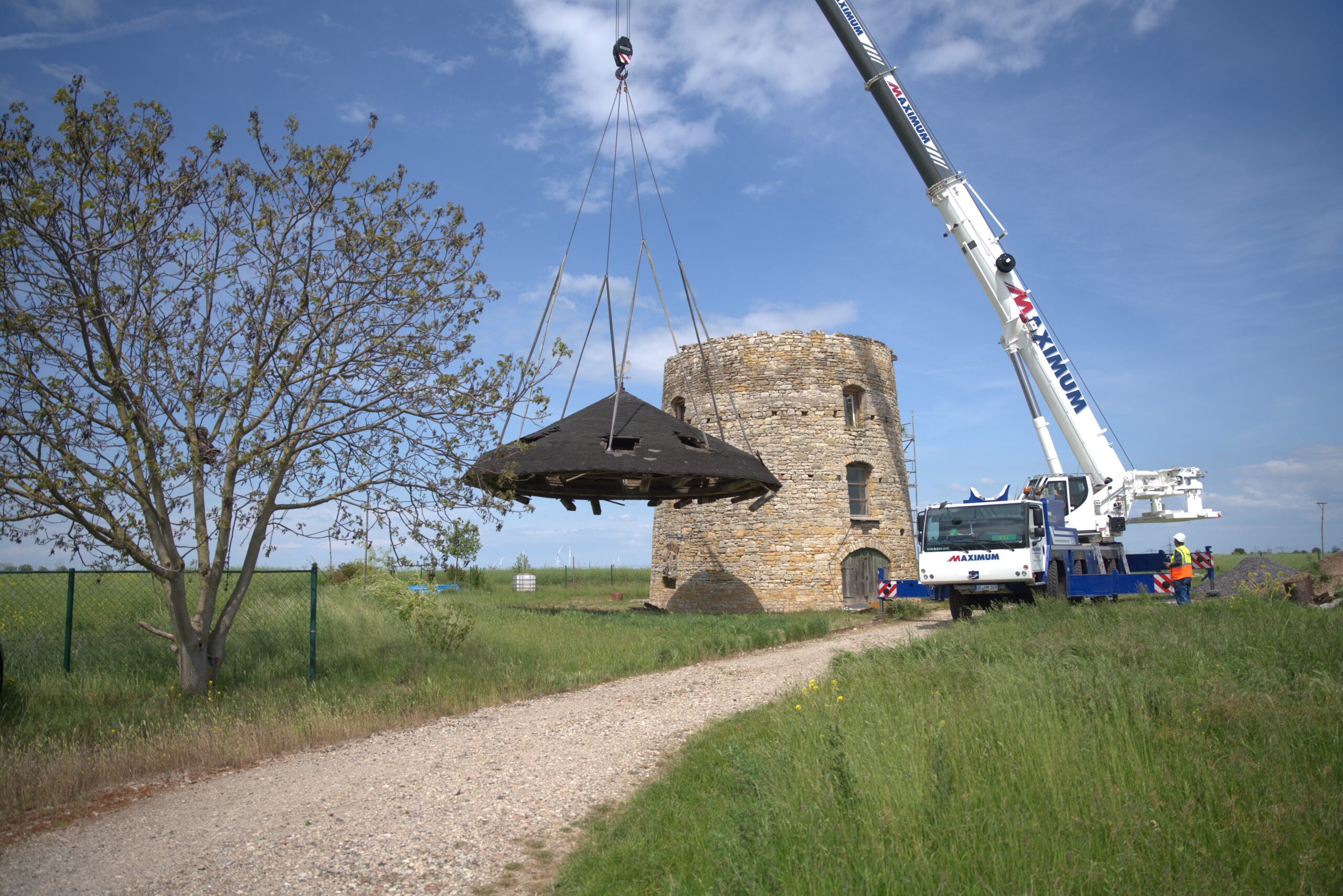 Um das Natursteingebäude aufzustocken und das alte Dach zu erneuern, war unser #Maximum-Team aus #Leuna mit einem #Liebherr #LTM1090-4.2 am Feldrand dabei. Mit acht langen Hebebändern nahm unser Kollege Kai das komplette Dach samt Wetterhahn bei 30 Metern Masthöhe behutsam an den Haken, ohne das Sandstein-Mauerwerk zu beschädigen.