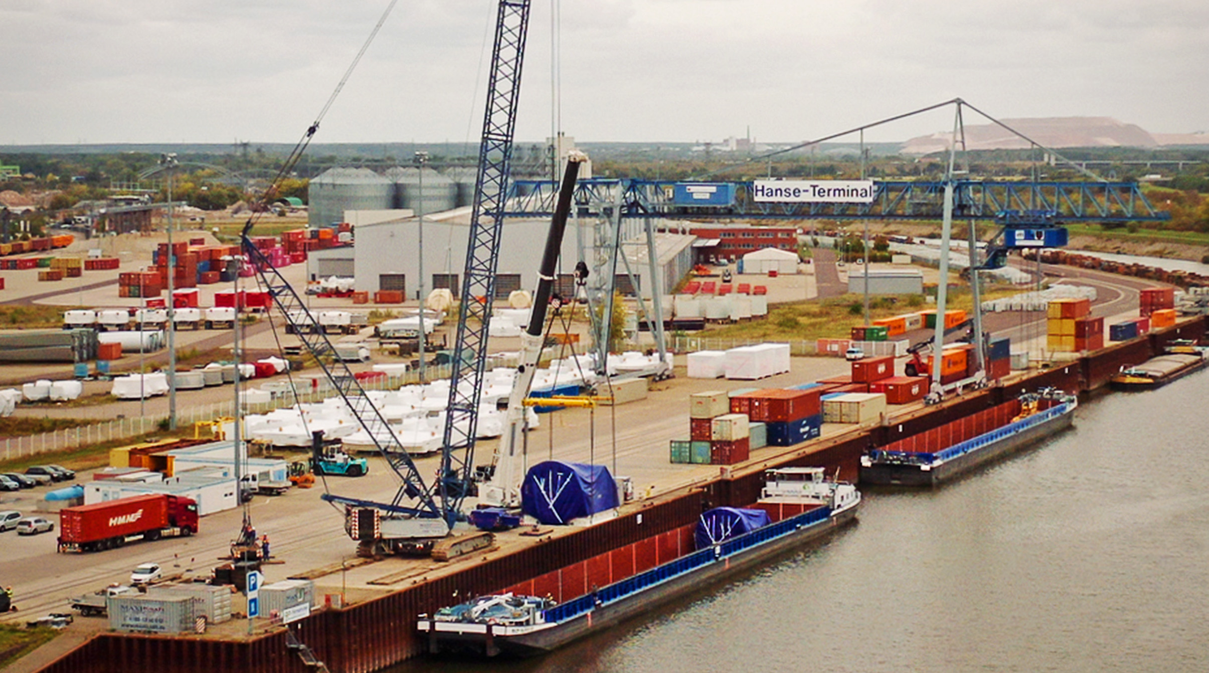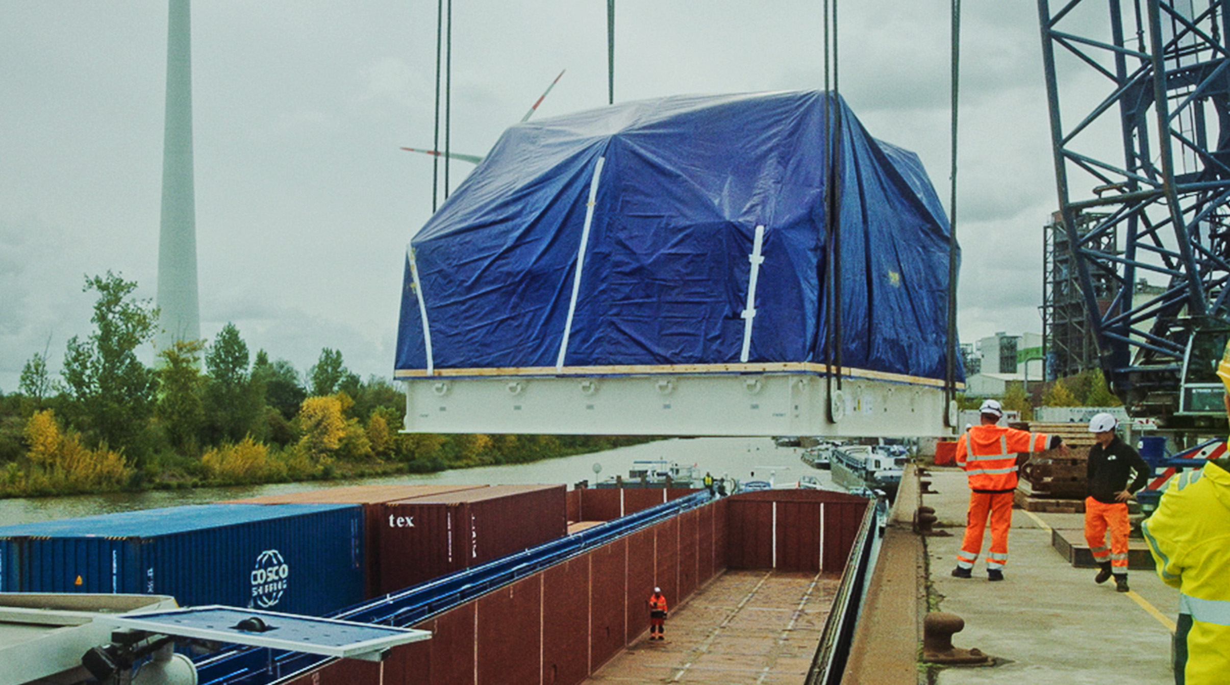Für die Premiere kamen die Module per LKW aus unserer Zentrale in Züllsdorf. In Magdeburg übernahm unser erfahrener Kollege Stephan aus Braunschweig die Powerpacks – und steuerte die beiden Turbinen mit 275 PS von der Montagehalle an die Kaimauer.