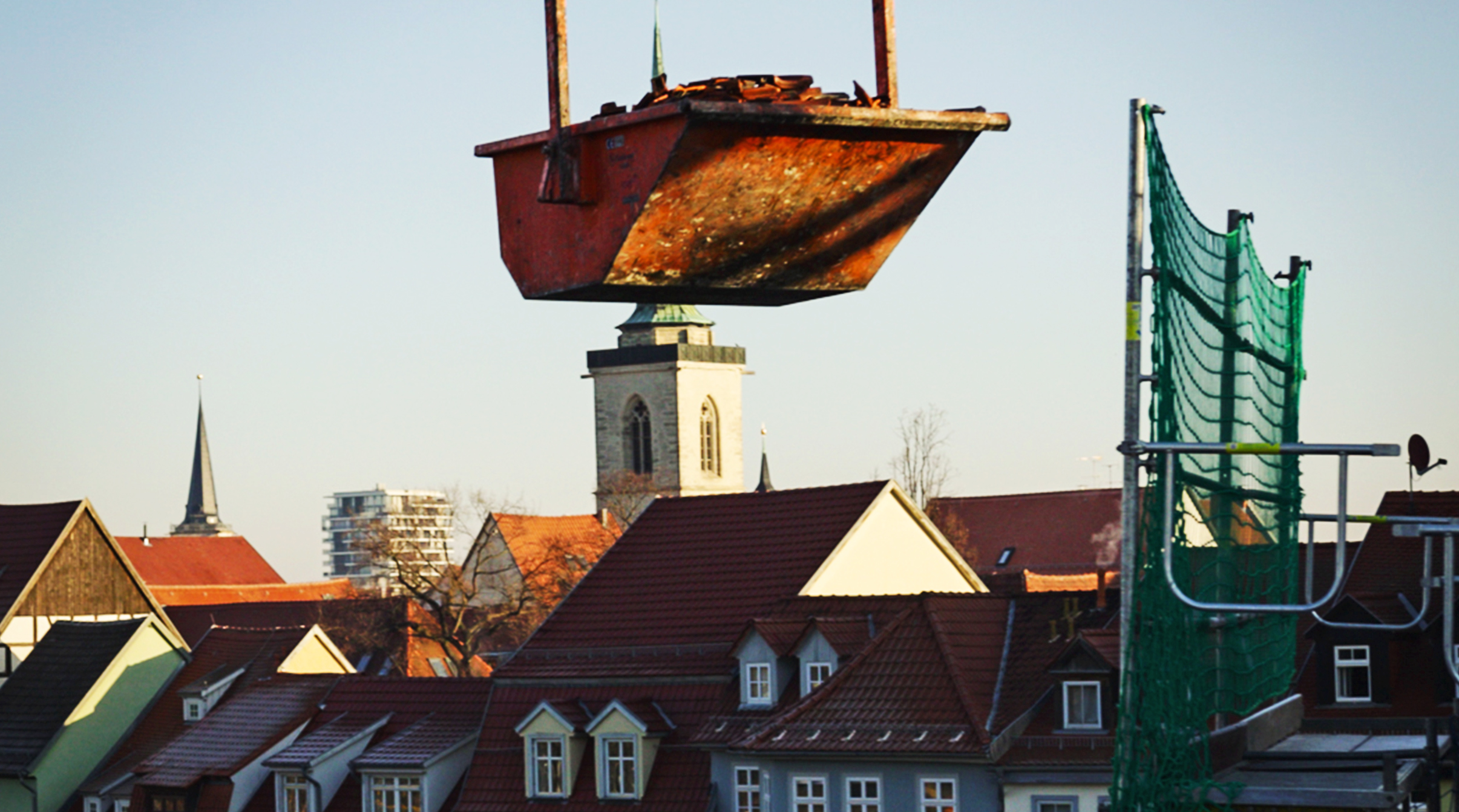 Keine drei Wochen nach dem verheerenden Feuer fuhr Kollege Volker mit dem mobilen Turmdrehkran vor. Trotz wenig Platz zwischen Häusern und Tram-Leitung klappte er den Mast in wenigen Minuten vollautomatisch auf. Dann unterstützte das Team unseren Kunden, die Dachdeckerei und Zimmerei #TorstenJäger aus #Witterda, alte Ziegel und Balken mit kleinen Schuttcontainern abzutragen. Zehn Tage waren sie dafür im Einsatz.